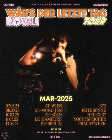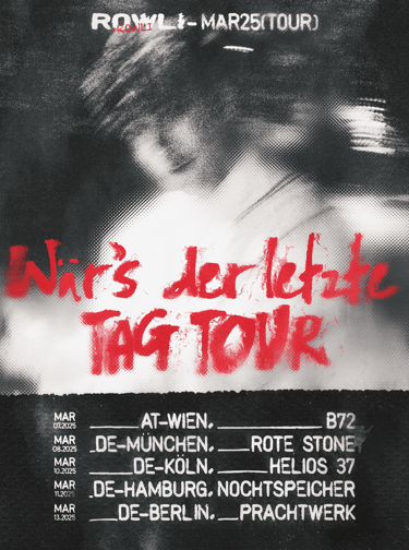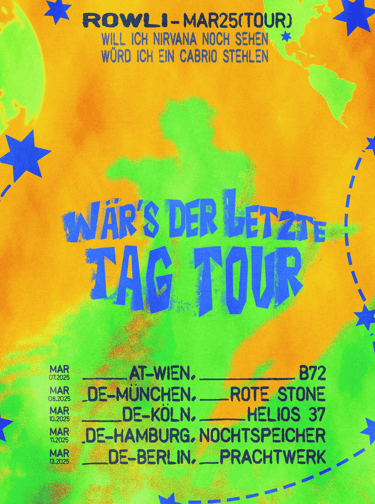 The "Tag Tour" is an indie music tour across German festivals and clubs, curated by artist "ROWLI". I'm exploring three distinct visual styles to identify the optimal aesthetic for the tour's musical identity. One style features dark mixed media, while the other two embrace a brighter, festival-oriented aesthetic with clean graphics.