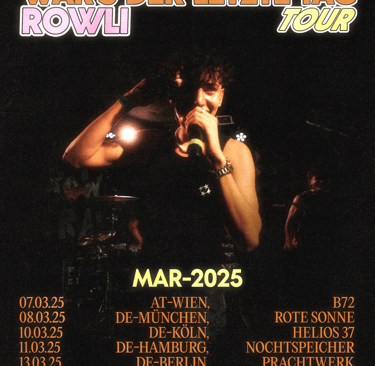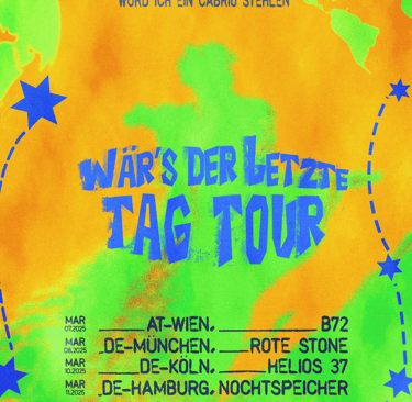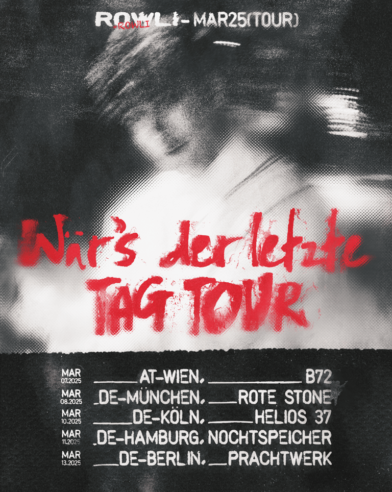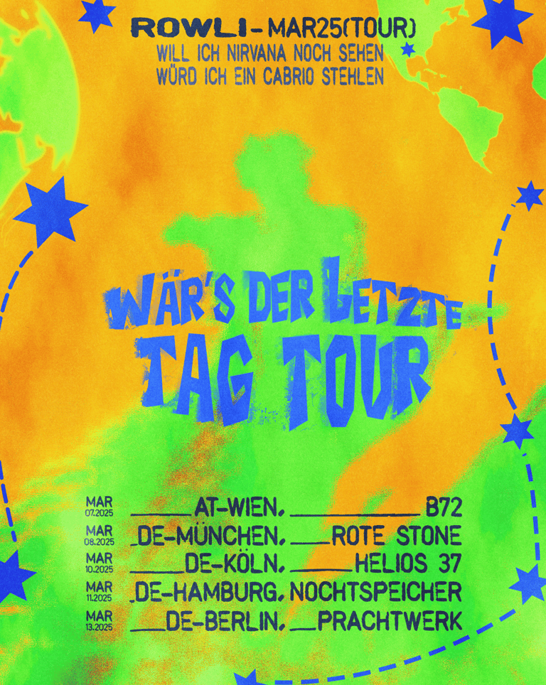 The "Tag Tour" is an indie music tour across German festivals and clubs, curated by artist "ROWLI". I'm exploring three distinct visual styles to identify the optimal aesthetic for the tour's musical identity. One style features dark mixed media, while the other two embrace a brighter, festival-oriented aesthetic with clean graphics.