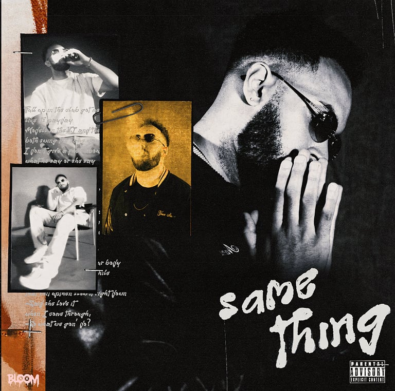 Whereas the SOS cover art presents a concept of reversed plea, the "same thing" artwork delves deeper into the artist's personal expression, employing a multifaceted approach with various materials to produce a visually striking and unique piece.